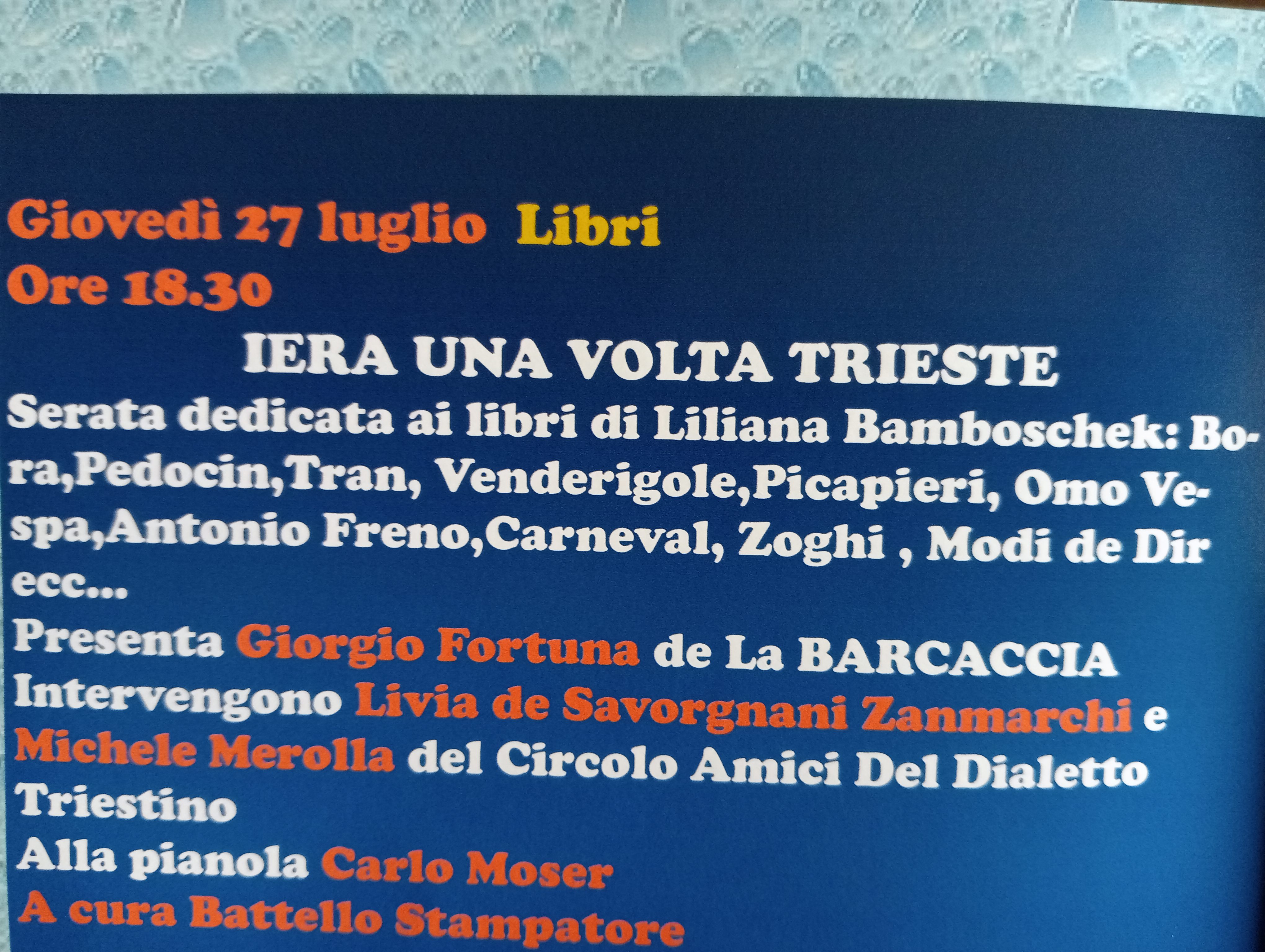 Giovedì 27 luglio, presso l’ Ex Lavatoio di via San Giacomo in Monte 9, in collaborazione con Battello Stampatore, è stata presentata “Iera una volta Trieste”, serata dedicata ai libri di Liliana Bamboschek; hanno partecipato i nostri soci Livia de Savorgnani Zanmarchi e Michele Marolla, alla pianola Carlo Moser, presentato Giorgio Fortuna.