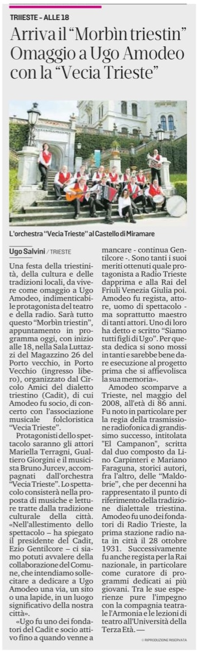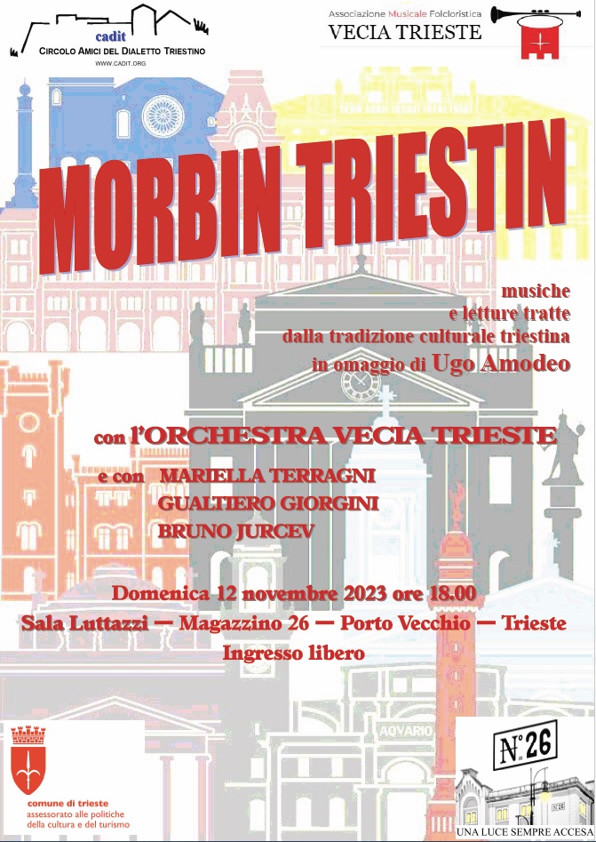 – domenica 12 novembre, alla Sala Luttazzi del Magazzino 26, grande spettacolo in omaggio allo scomparso regista Ugo Amodeo dal titolo “Morbin Triestin“, grazie alla collaborazione tra l’Orchestra Vecia Trieste, gli attori Mariella Terragni e Gualtiero Giorgini ed il pianista Bruno Jurcev.