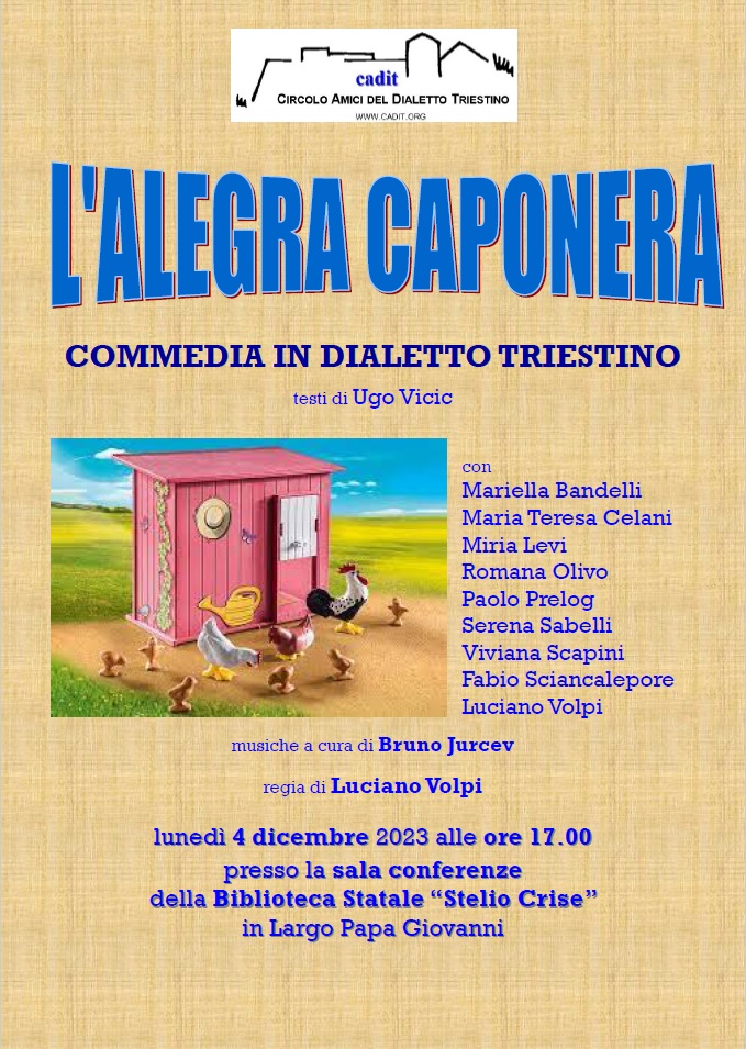 – lunedì 4 dicembre, presso la sala conferenza della Biblioteca Statale Stelio Crise di Largo Papa Giovanni XXIII, I Commedianti di Ugo Amodeo hanno presentato l’atto unico “La alegra caponera” di Ugo Vicic (presente alla rappresentazione) per la regia di Luciano Volpi con musiche a cura di Bruno Jurcev.